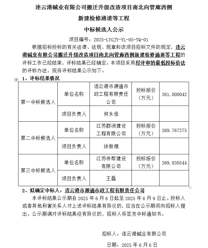 搬遷升級改造項(xiàng)目南北向管廊西側(cè)新建檢修通道等工程中標(biāo)候選人公示