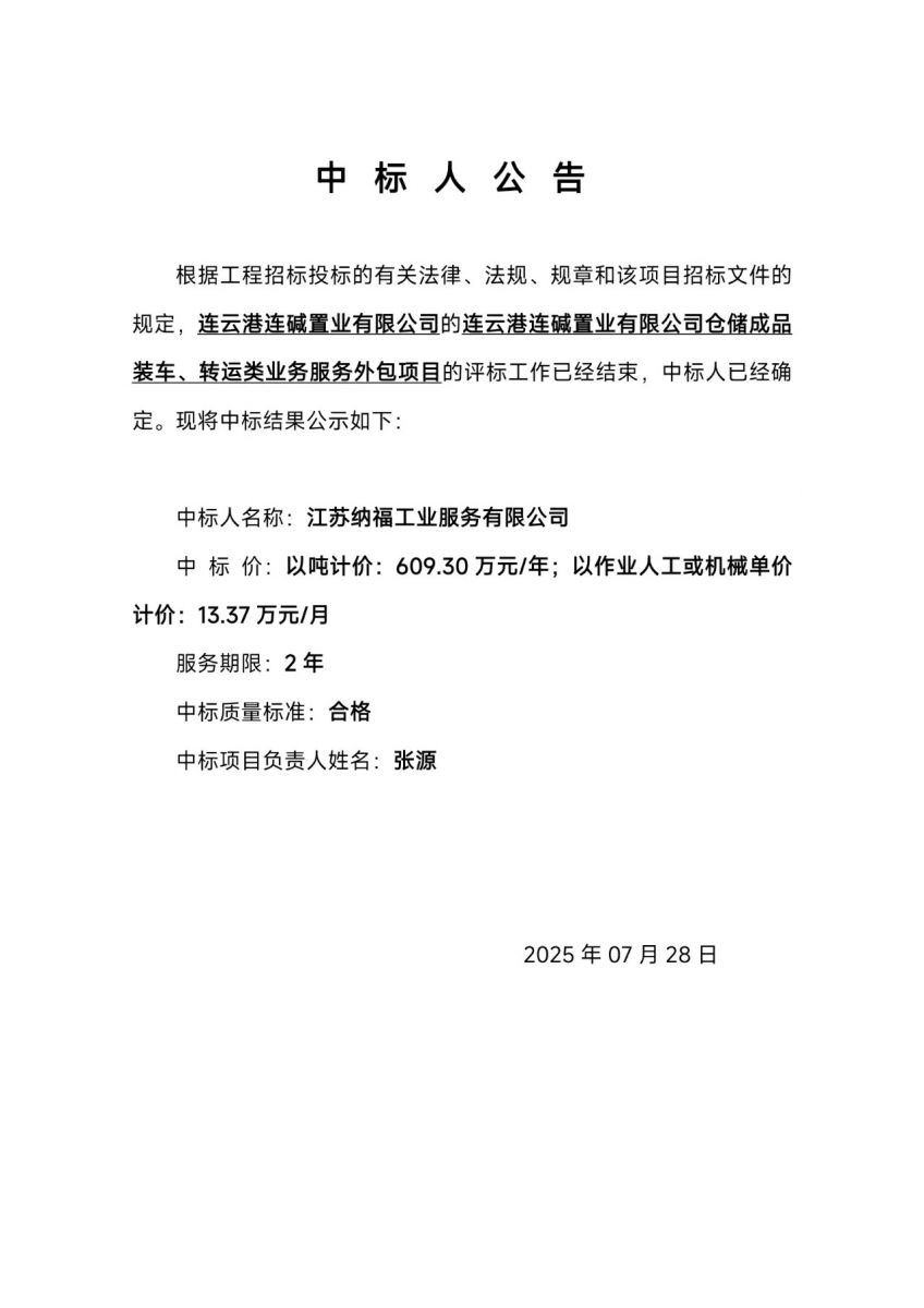 連云港連堿置業(yè)有限公司倉儲成品裝車、轉(zhuǎn)運(yùn)類業(yè)務(wù)服務(wù)外包項目中標(biāo)人公告