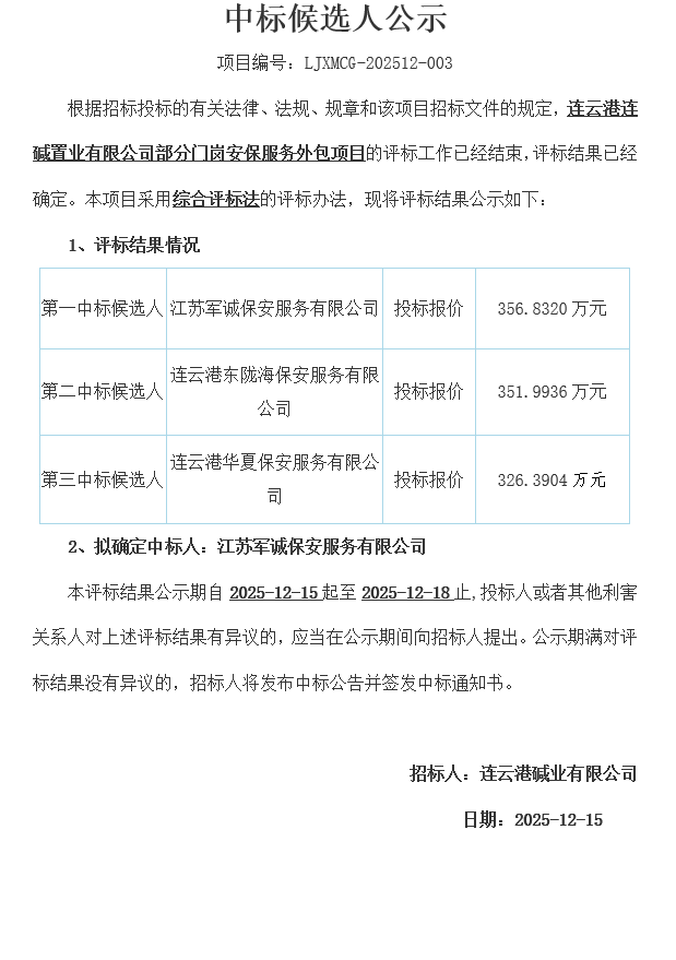 連云港連堿置業(yè)有限公司部分門崗安保服務(wù)外包項目中標候選人公示