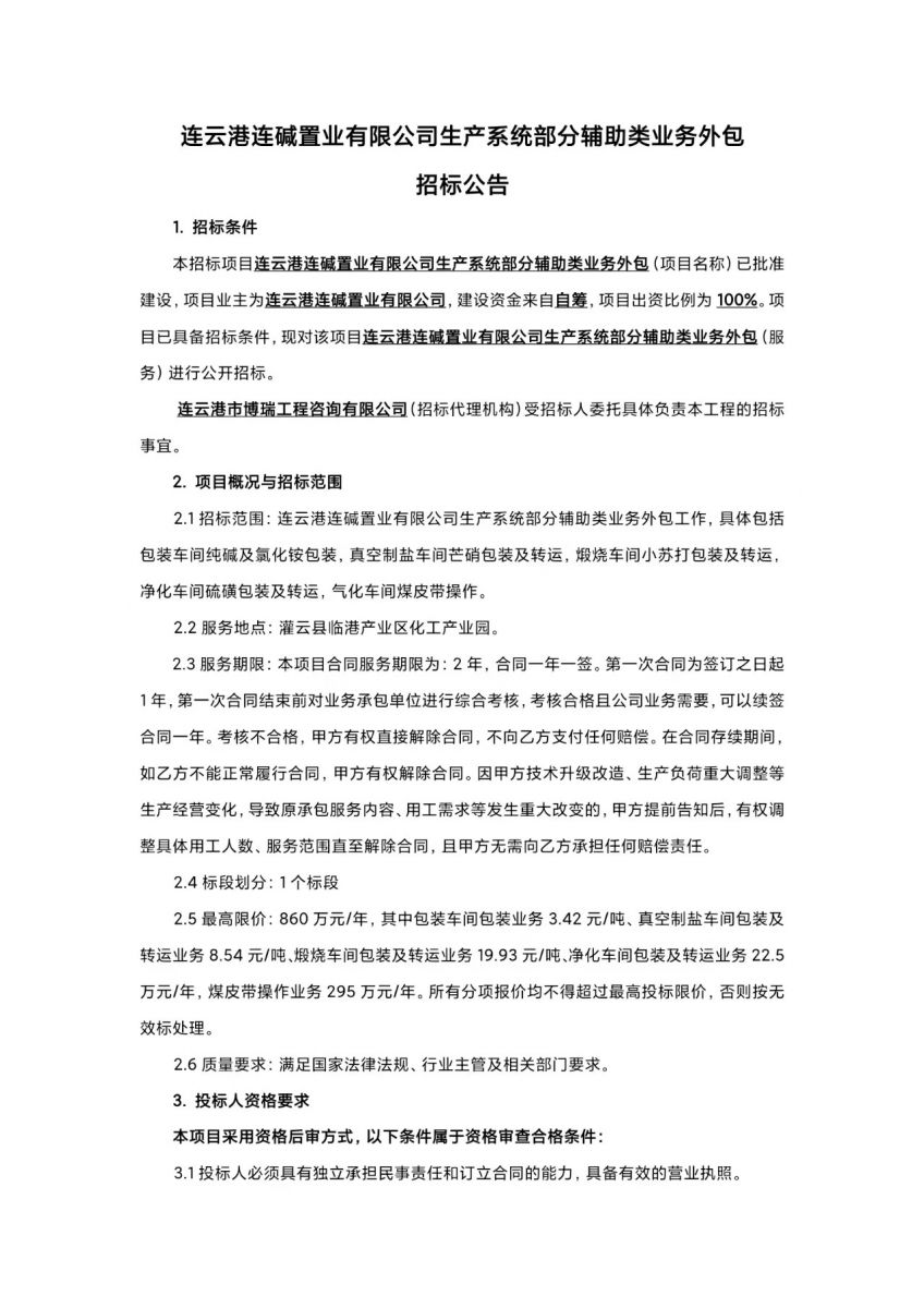 連云港連堿置業(yè)有限公司生產(chǎn)系統(tǒng)部分輔助類業(yè)務(wù)外包招標(biāo)公告