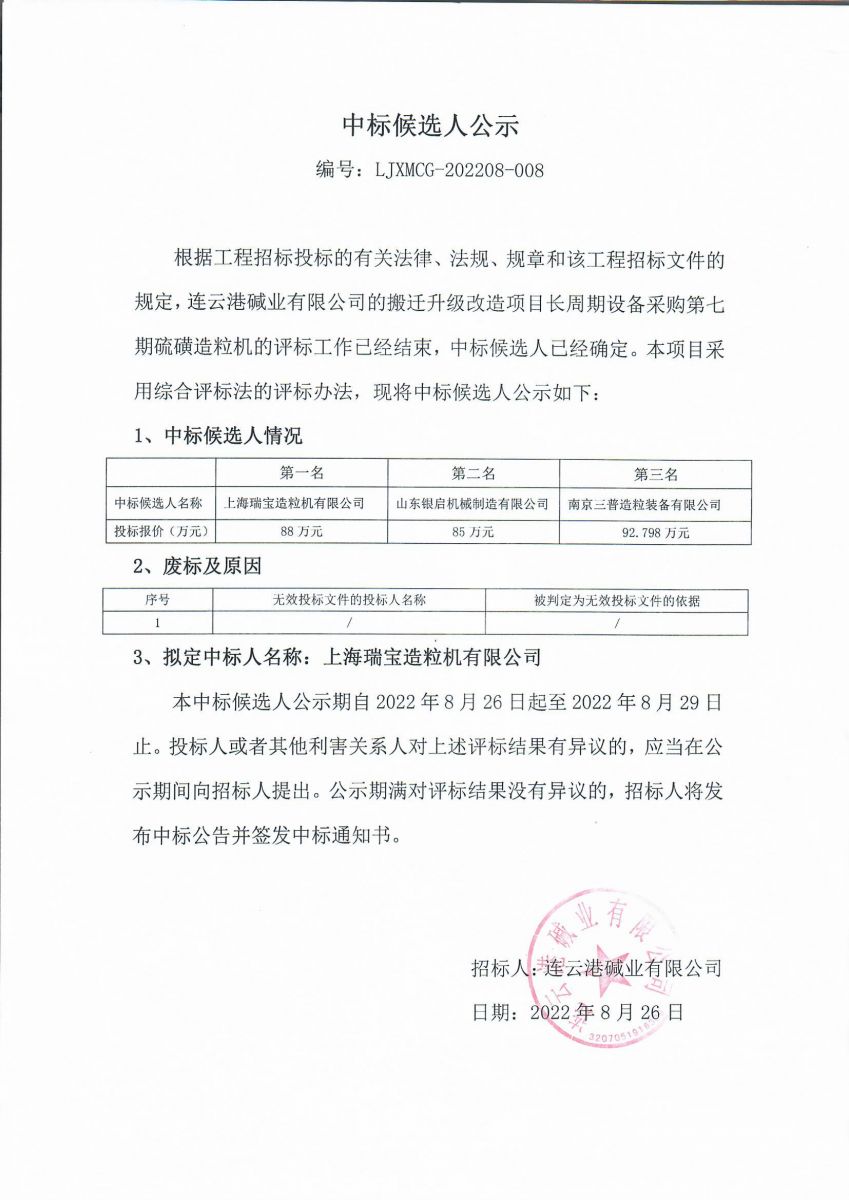 搬遷升級改造項(xiàng)目硫磺造粒機(jī)中標(biāo)候選人公示
