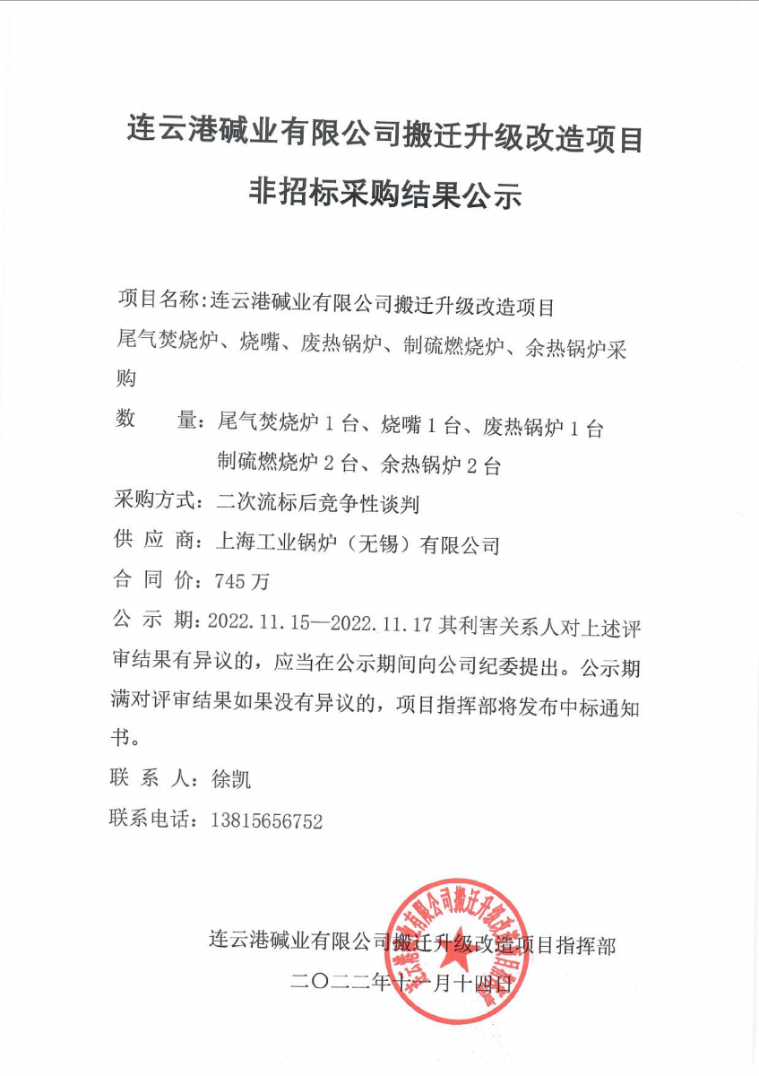 尾氣焚燒爐等設(shè)備非招標(biāo)采購(gòu)結(jié)果公示