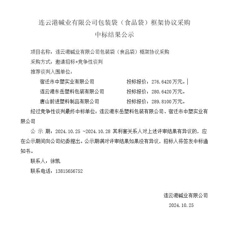 連云港堿業(yè)有限公司包裝袋(食品袋)框架協(xié)議采購(gòu)中標(biāo)結(jié)果公示