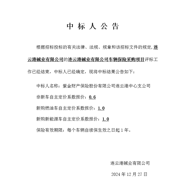 連云港堿業(yè)有限公司車輛保險(xiǎn)采購(gòu)項(xiàng)目中標(biāo)人公告