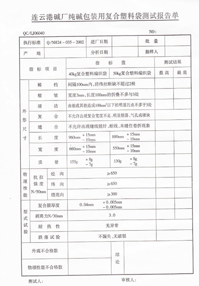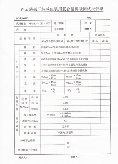 5.6 其他主要資格要求:具有合法有效的生產(chǎn)許可資質,企業(yè)制度完善、質量管理規(guī)范,具有完整的拉絲、織布、縫紉、檢測等生產(chǎn)線,注冊資金不少于500萬元(人民幣)。食品包裝袋投標人應具備食用包裝物生產(chǎn)許可資質,并提供第三方檢測報告。投標人必須送樣品袋先經(jīng)我公司質檢部門檢測合格(2018年10月20日之前送到連云港堿業(yè)有限公司供應部,原招標人供應商不需送樣品袋)。符合法律、法規(guī)規(guī)定的其他條件。